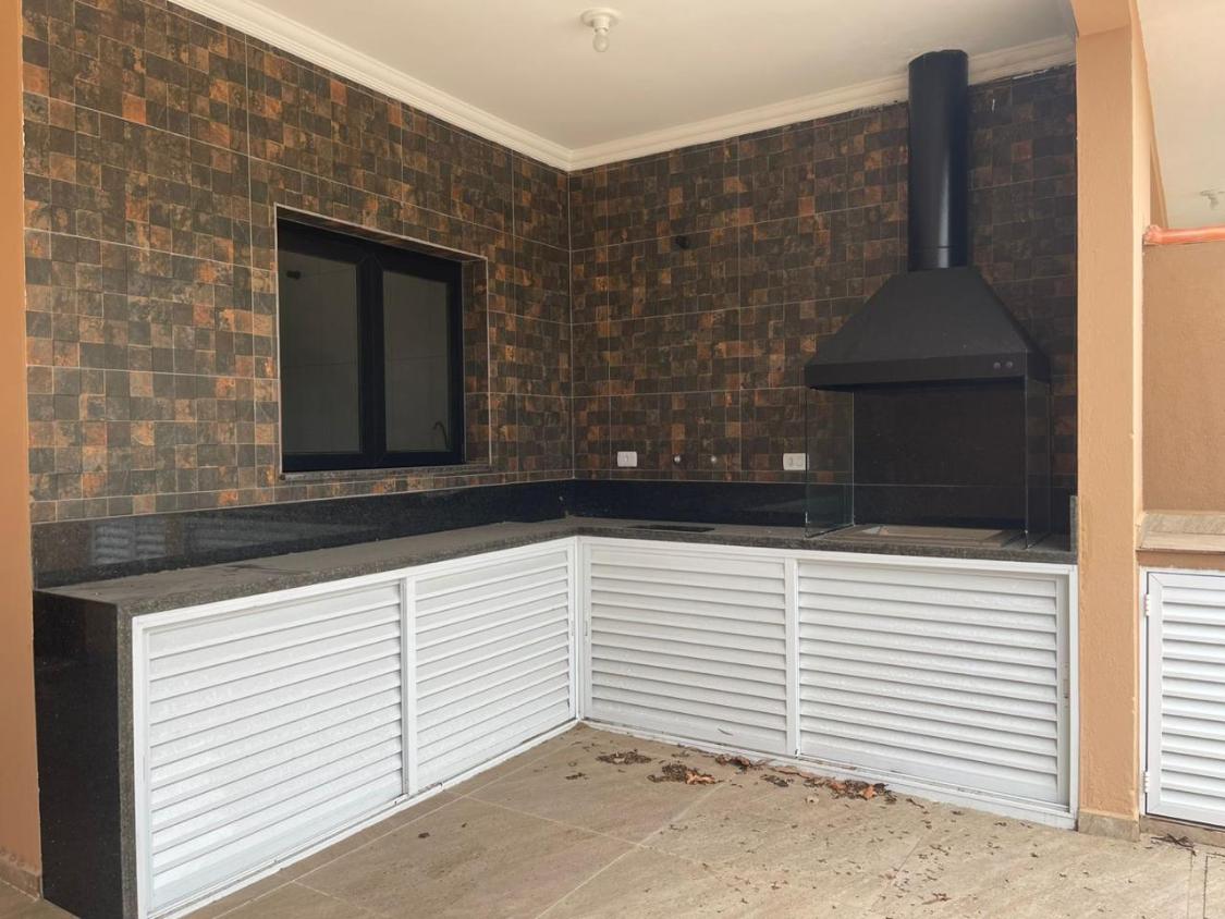 Área gourmet com churrasqueira moderna pia em mármore armários planejados quintal nos fundos ideal para pets ou jardim e chuveiro lava pés na área externa